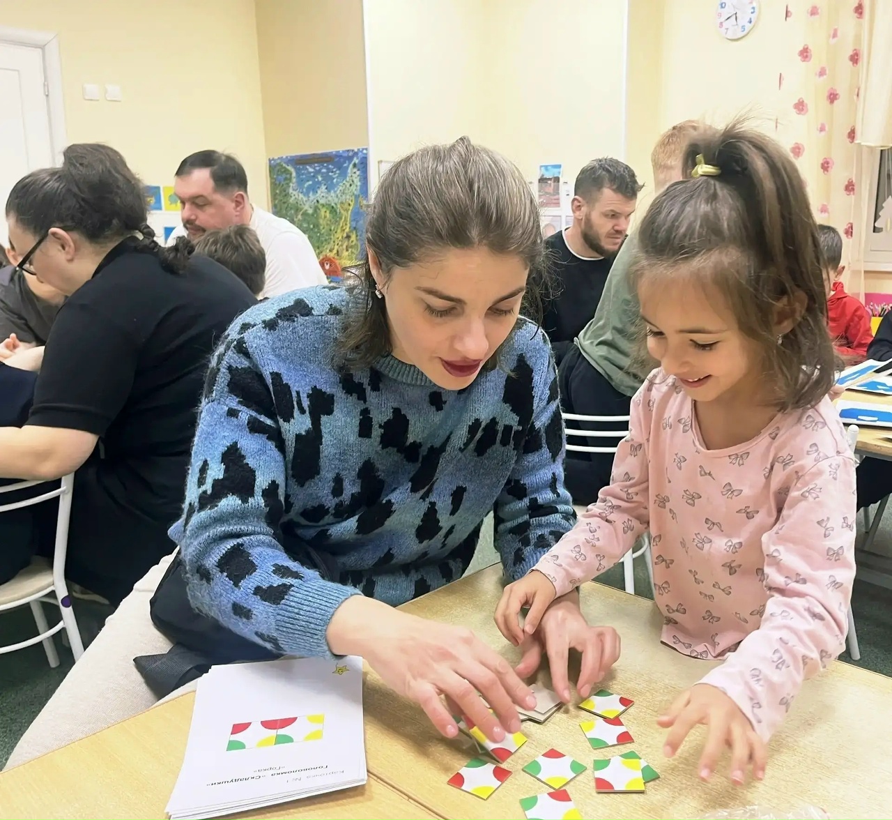 С большим удовольствием и азартом взрослые и дети вместе погружались в решение задач, сообща искали нужные детали, складывали фигуры и радовались общему успеху.