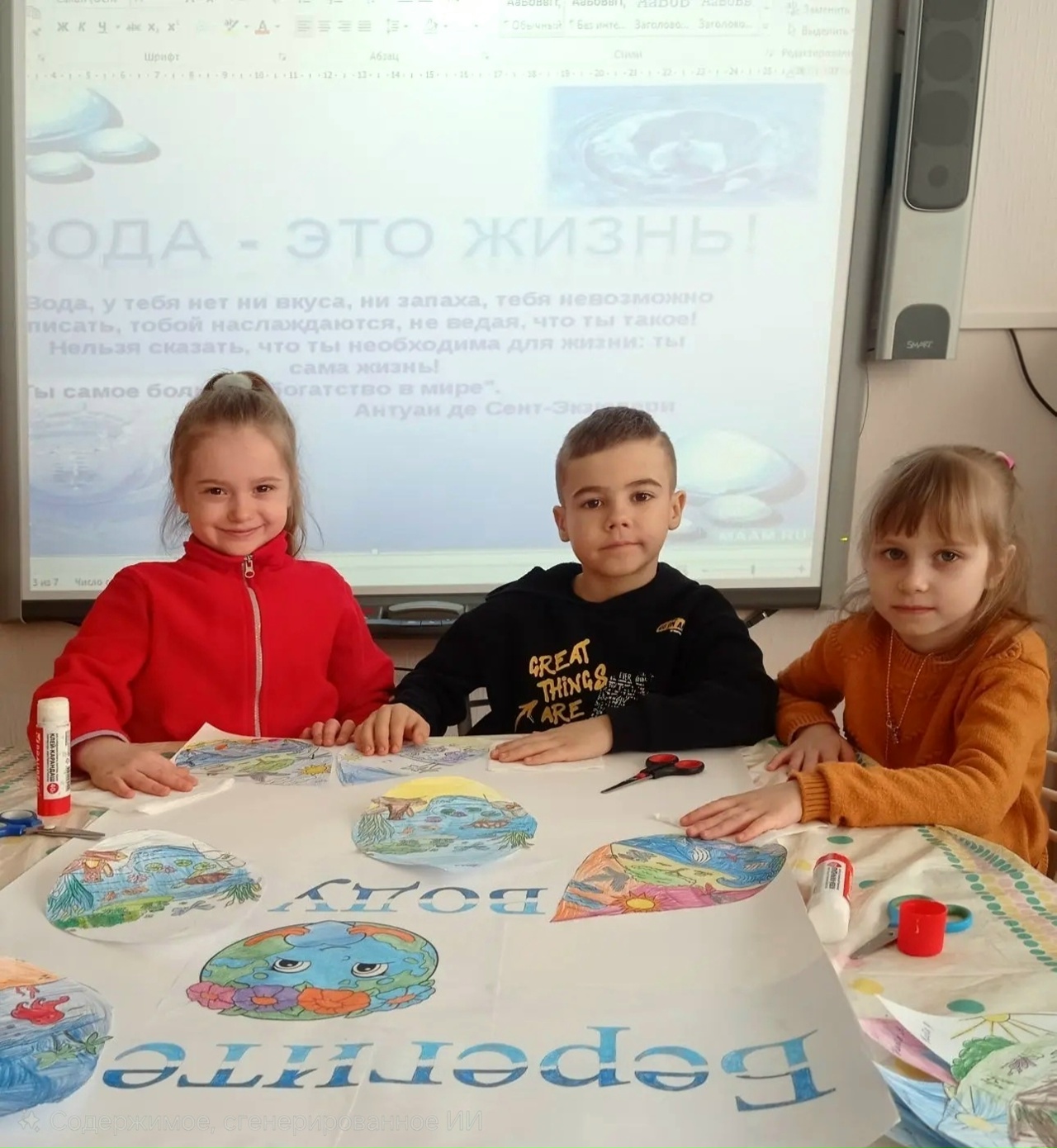 Особый отклик вызвала творческая деятельность. Юные экологи изготовили символические браслеты, которые стали для них напоминанием о том, что воду нужно расходовать экономно и с уважением. Своё понимание важности сохранения водных богатств дети отразили в рисунках, а объединив усилия, создали яркую коллективную аппликацию «Берегите воду!».